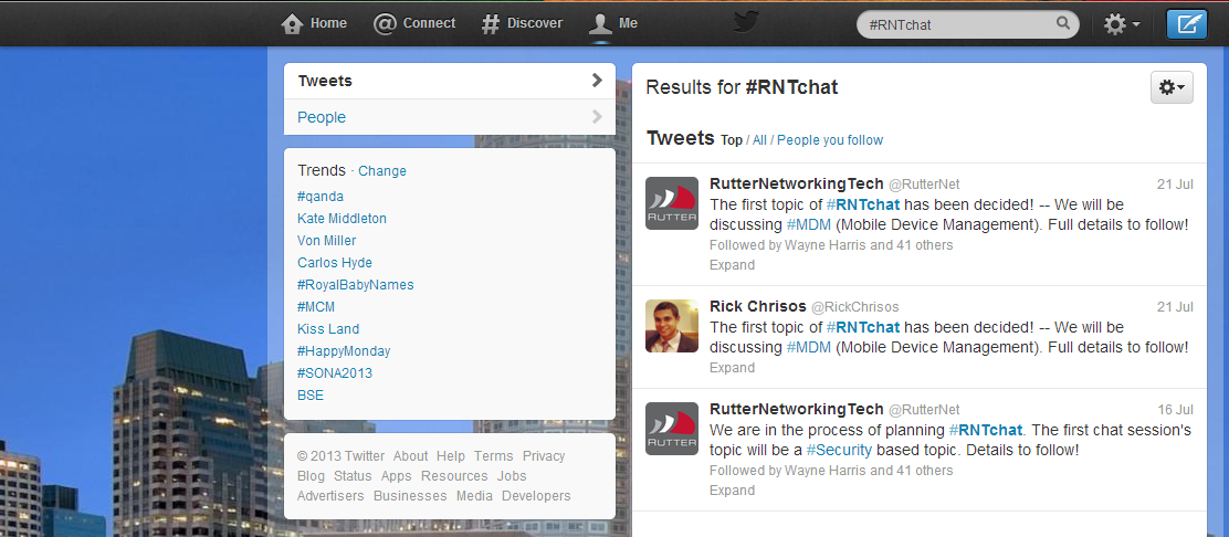 In the coming weeks, Rutter Networking Technologies will begin conducting a series of web chats via Twitter. These chats will provide an open forum to discuss the latest trends in IT spanning across various topics like BYOD (Bring Your Own Device), BC/DR (Business Continuity & Disaster Recovery) and MDM (Mobile Device Management) just to name a few. Never joined a Twitter Chat before? No worries, we’ve got you covered. Just follow the instructions below!
