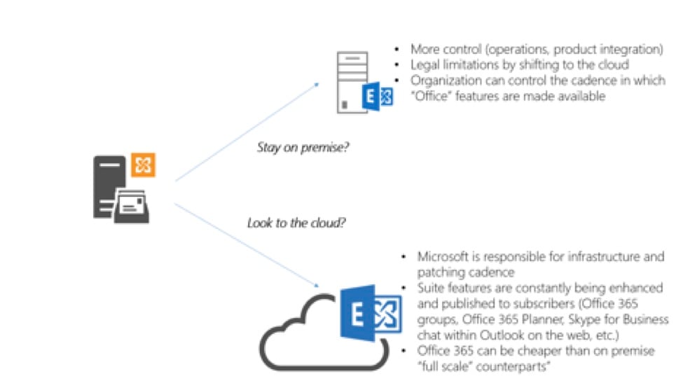 With Exchange 2010 now in extended support, many companies are in are in the fork in the road in determining their Office 365 trajectory. Common considerations are shown in the diagram above.